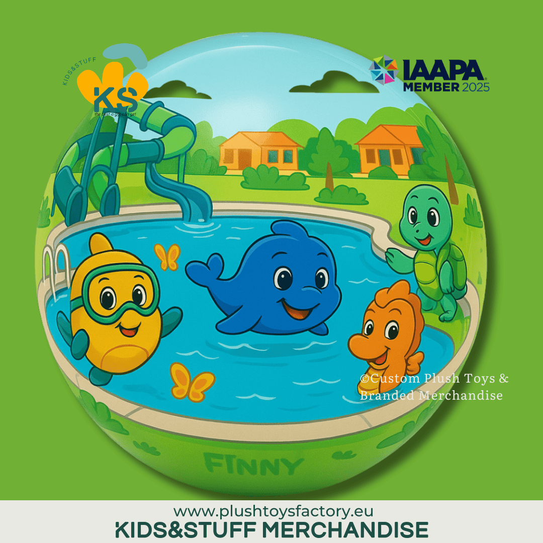 10 cm PVC ball with a full 360° character print featuring Finny, Wavy, Shelly, Bubb and friends. Lightweight, safe, and perfect for branded giveaways or campsite merchandise.
