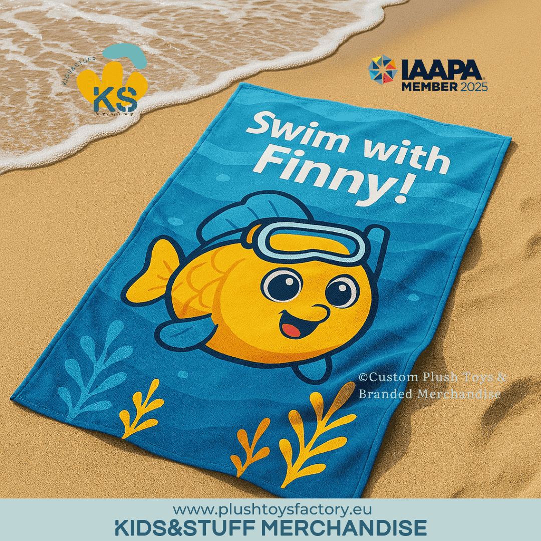 Perfect for holiday parks, aquariums, kids’ clubs, or water-themed events, this branded merchandise set combines huggable fun with practical use. The towel is made from soft 400gsm cotton, while the plush is EN71 / CE & GPSR compliant for child safety.