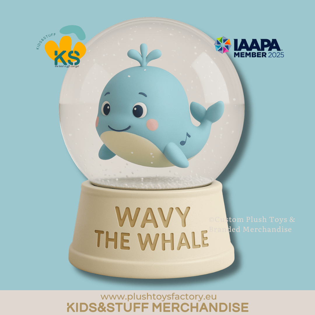 Make a splash with the Wavy the Whale Snowglobe – a magical keepsake designed to delight children and families! Inside the crystal-clear globe, the smiling Wavy figurine floats amidst swirling white glitter. The base is crafted from durable colored resin, custom-engraved with the Wavy character name.